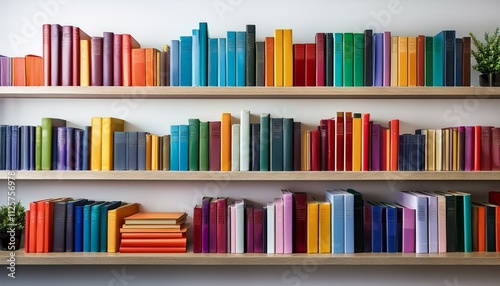 Fototapeta premium 白背景の中、カラフルな本が美しく並べられた本棚のシンプルな美