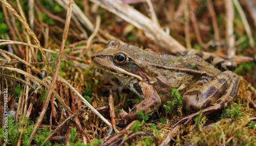 Fototapeta premium 작은 연못가의 말라버린 이끼 사이에서 마지막으로 남은 개구리 한 마리