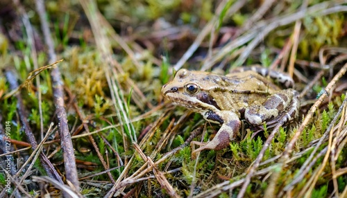 Fototapeta premium 작은 연못가의 말라버린 이끼 사이에서 마지막으로 남은 개구리 한 마리