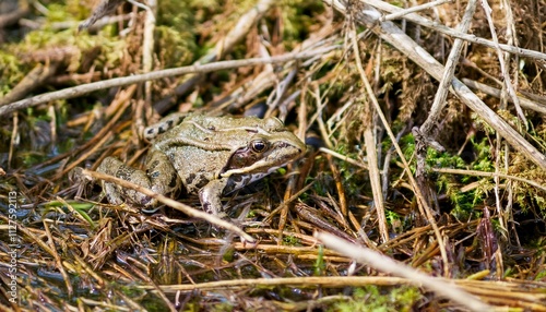 Fototapeta premium 작은 연못가의 말라버린 이끼 사이에서 마지막으로 남은 개구리 한 마리