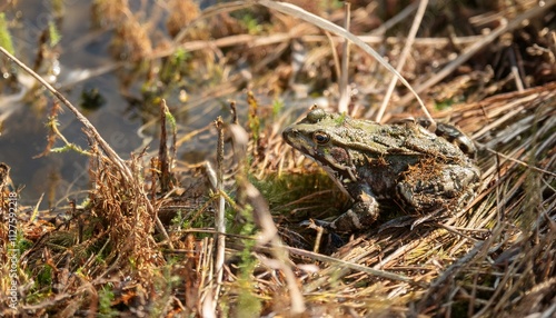 Naklejka premium 작은 연못가의 말라버린 이끼 사이에서 마지막으로 남은 개구리 한 마리