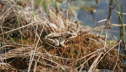 © 문용 최, Obraz premium 작은 연못가의 말라버린 이끼 사이에서 마지막으로 남은 개구리 한 마리