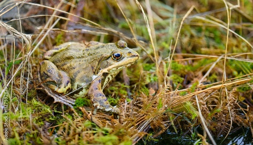 Fototapeta premium 작은 연못가의 말라버린 이끼 사이에서 마지막으로 남은 개구리 한 마리