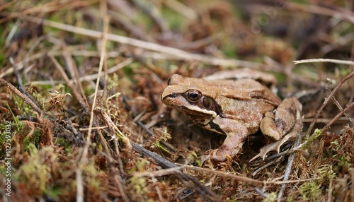 Obraz premium 작은 연못가의 말라버린 이끼 사이에서 마지막으로 남은 개구리 한 마리