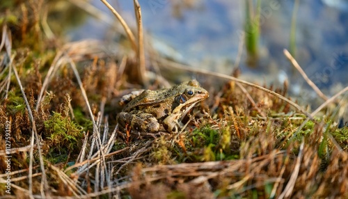 Obraz premium 작은 연못가의 말라버린 이끼 사이에서 마지막으로 남은 개구리 한 마리