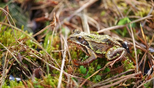 Fototapeta premium 작은 연못가의 말라버린 이끼 사이에서 마지막으로 남은 개구리 한 마리