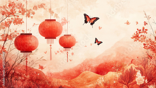 Obraz premium 日本風デザインの赤い提灯と花のデジタルアート