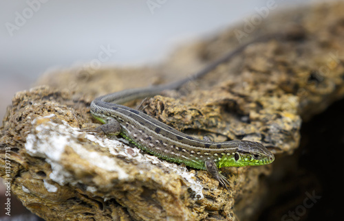 © ovbelov1972, Obraz premium Серо-зеленая ящерица греется на камнях