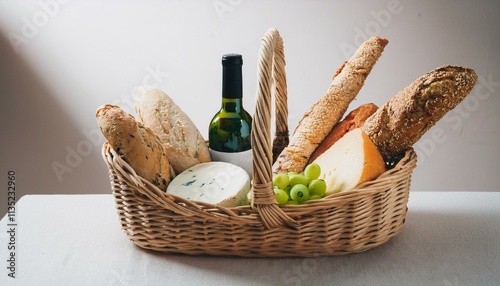 Naklejka premium 바구니 안에 다양한 종류의 빵, 치즈, 올리브와 함께 놓인 작은 와인 병