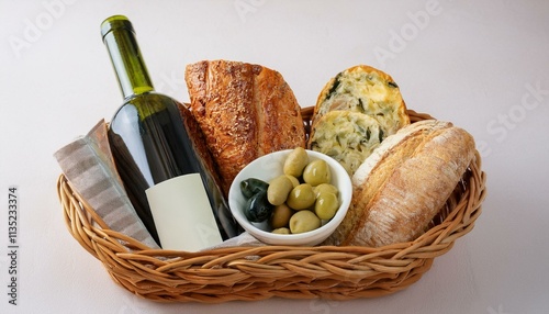 Naklejka premium 바구니 안에 다양한 종류의 빵, 치즈, 올리브와 함께 놓인 작은 와인 병