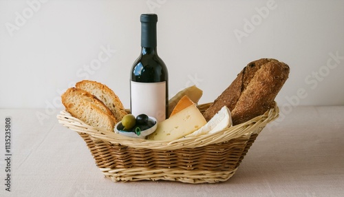 Naklejka premium 바구니 안에 다양한 종류의 빵, 치즈, 올리브와 함께 놓인 작은 와인 병