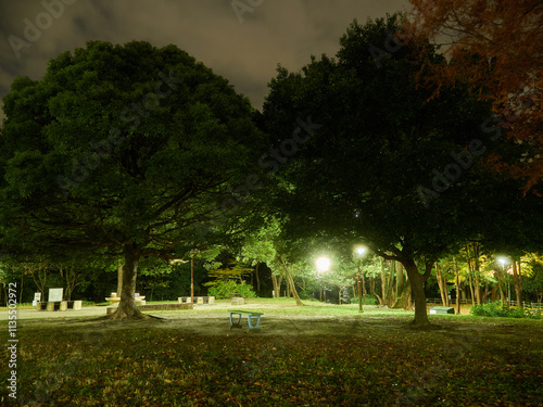 © zheng qiang, Obraz premium 冬の夜の静かな公園の森の風景