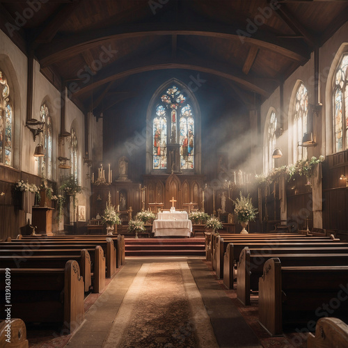 © Kaori, Fototapeta premium 教会 木造 アンティーク ビンテージ ステンドグラス 古い 十字架 窓 光 花束 祭壇