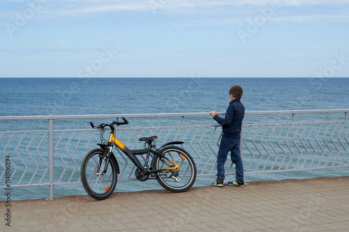 © lastfurianec, Obraz premium Мальчик с велосипедом смотрит на море стоя на набережной промеданте