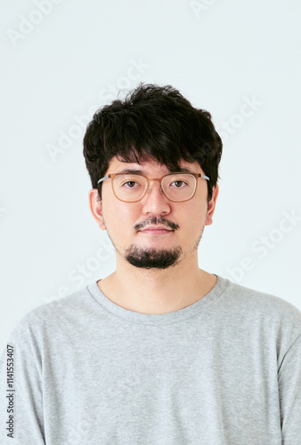 © TAGSTOCK2, Obraz premium 白背景で眼鏡をかけた髭を生やしたカメラ目線の30代の1人の日本人男性の人物の上半身の正面