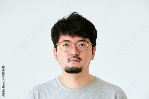 Obraz premium 白背景で眼鏡をかけた髭を生やしたカメラ目線の30代の1人の日本人男性の人物の上半身の正面