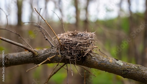 © 순단 강, Fototapeta premium 벌목된 숲 근처에 남아 있는 나뭇가지 위 작은 새둥지