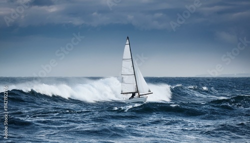 © 순단 강, Naklejka premium 거대한 파도를 정면으로 마주하는 작고 단단한 돛단배