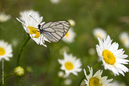 Obraz premium Бабочка на ромашке. \ Белая бабочка на ромашке,рядом также ромашки,фон-зелёный.