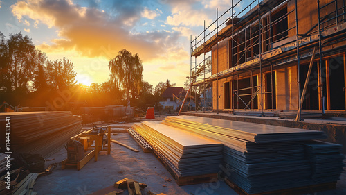 Fototapeta premium ガルバリウム鋼板が置かれた外壁工事の夕景