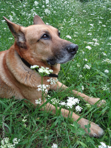 © lana4ka, Obraz premium Собака овчарка лежит в зеленой траве среди белых полевых цветов