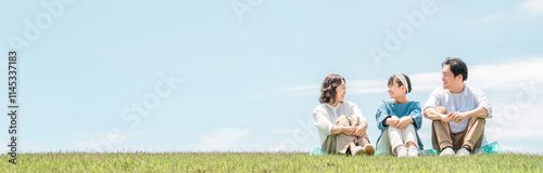 Fototapeta premium 青空の見える公園・丘に座る家族・親子(父親・母親・娘)