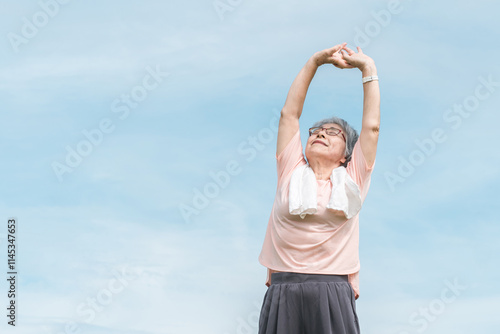Obraz premium 公園でラジオ体操・ストレッチ・深呼吸・柔軟体操をする高齢者男性
