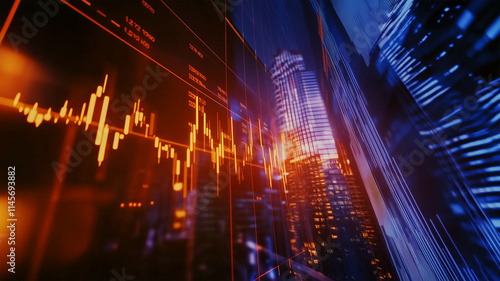 © bephoto, Obraz premium 都市の背景に浮かぶ株式市場のチャート