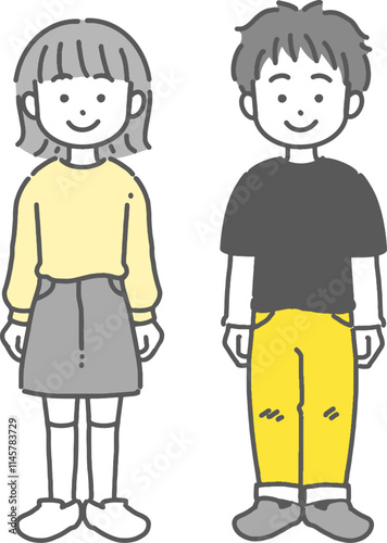 Fototapeta premium 立っている男の子と女の子のかわいい線画イラスト