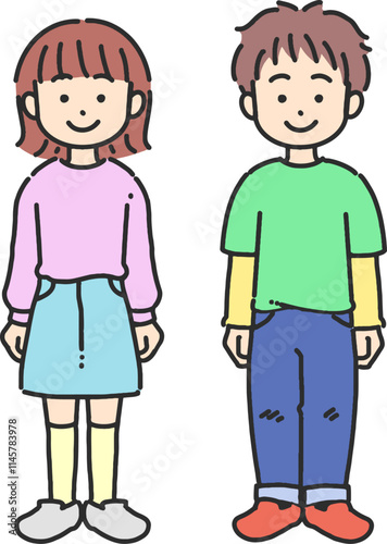 Fototapeta premium 立っている男の子と女の子のかわいい線画イラスト