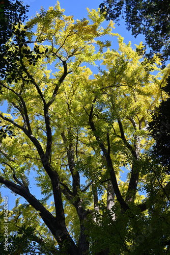 © ikeyama, Fototapeta premium 色付き始めた銀杏の木、戸定ヶ丘歴史公園にて