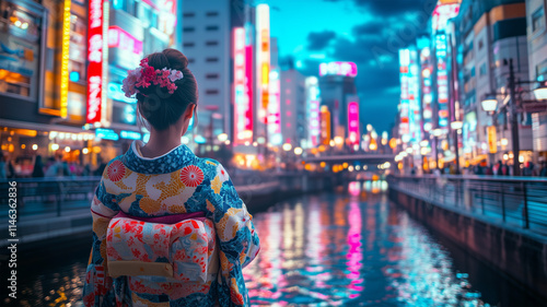 Fototapeta premium 道頓堀の川沿いで夜景を楽しむ着物姿の女性
