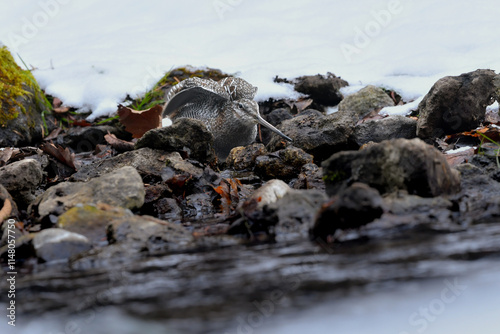 Obraz premium 雪の積もった真冬の山の渓流で見られる忍者のような渡り鳥、アオシギ