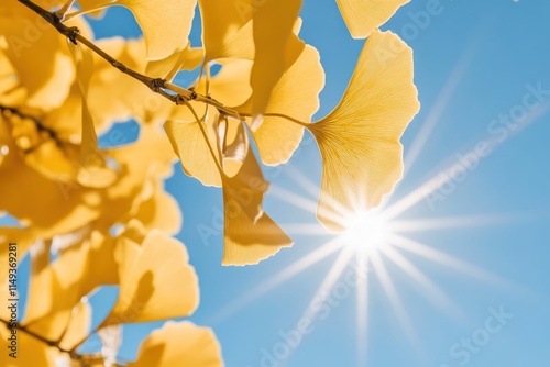Obraz premium 青空に映えるイチョウの葉とまぶしい太陽の光の美しい瞬間