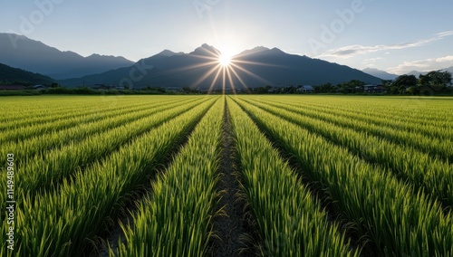Fototapeta premium 美しい山々の背景に広がる緑の稲田と朝日が昇る瞬間