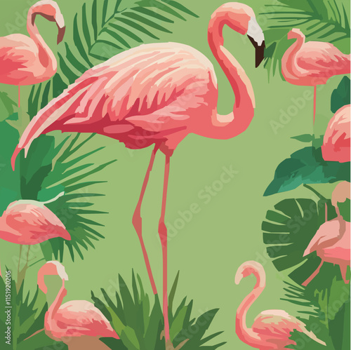 Fototapeta premium ピンクのフラミンゴと緑の背景のベクターイラスト