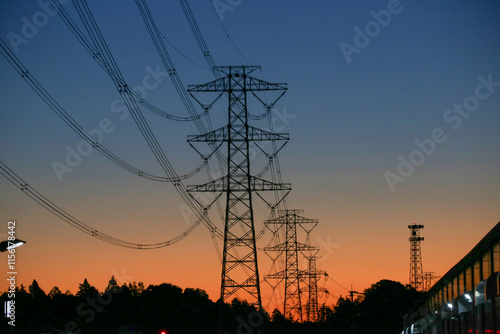 © TeTsumi, Fototapeta premium 夜明けの空と高圧線