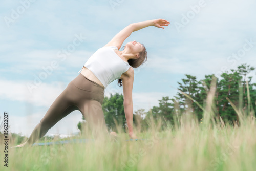 Fototapeta premium 草原の中でヨガ・ストレッチ・ピラティス・ボディケアをする女性(ヘルスケア・ダイエット・健康維持)