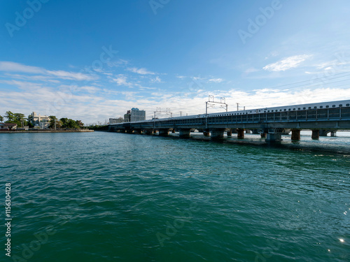 Obraz premium 浜名湖の弁天島を通過する東海道新幹線