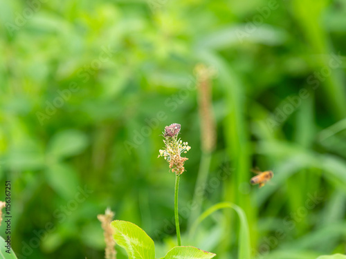 Obraz premium 河川敷の花に止まるブチヒゲカメムシ