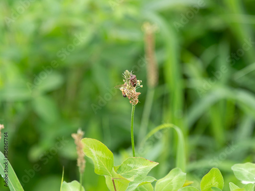 Obraz premium 河川敷の花に止まるブチヒゲカメムシ