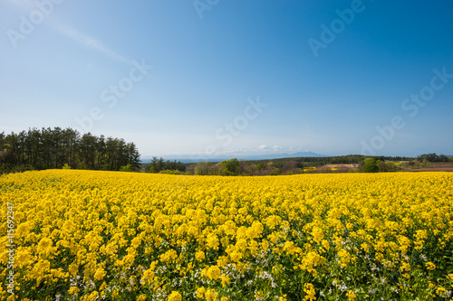 © chanman48, Fototapeta premium 絶景、菜の花畑 / 見渡す限り菜の花畑が広がります。その向こうには山と海が見えます。