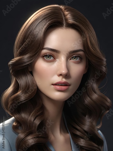© CreativeVirginia, Fototapeta premium 長い波打つ髪と穏やかな表情の若い女性の肖像。顔の細部、光沢のある髪、ぼかされた背景が優雅さと繊細さを醸し出します。柔らかな照明が自然な美しさと繊細な色調を引き立てます。
