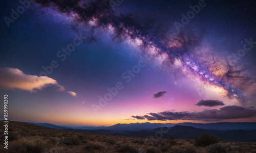 Obraz premium 화려한 우주 풍경을 상상해 보세요. 강렬한 보라색, 깊은 파란색, 반짝이는 분홍색이 어우러져 소용돌이치는 성운을 형성합니다.