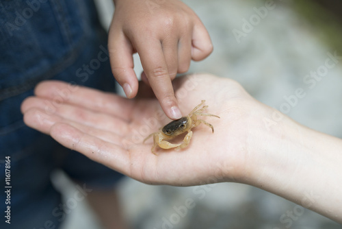 Obraz premium 沢蟹を見つけた親子