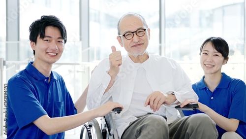 Obraz premium 介護士とグッドサインをする車椅子の高齢者