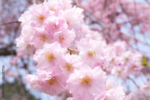 Fototapeta premium 満開のピンク色の桜の花と春の陽射し