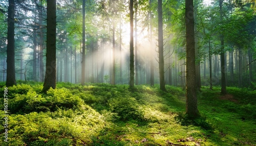 Obraz premium 朝の光が差し込み、霧が立ち込める深い森