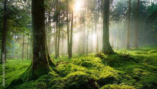 Obraz premium 朝の光が差し込み、霧が立ち込める深い森