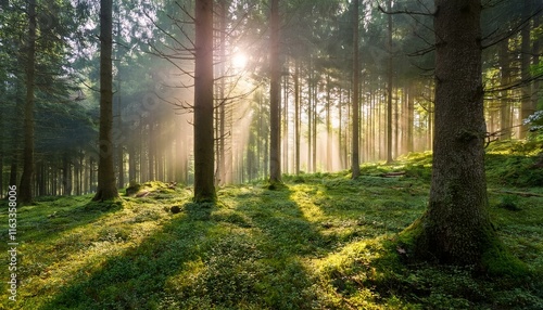 Obraz premium 朝の光が差し込み、霧が立ち込める深い森